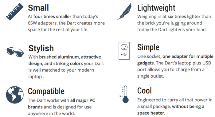 Dart, il più piccolo adattatore per ricaricare i propri laptop (ma non solo). Il progetto-prodotto è stato presentato al CES ed è ora in crowfunding sulla piattaforma Kickstarter, dove rimarrà fino al 14 Maggio 2014, data di scadenza della raccolta fondi.