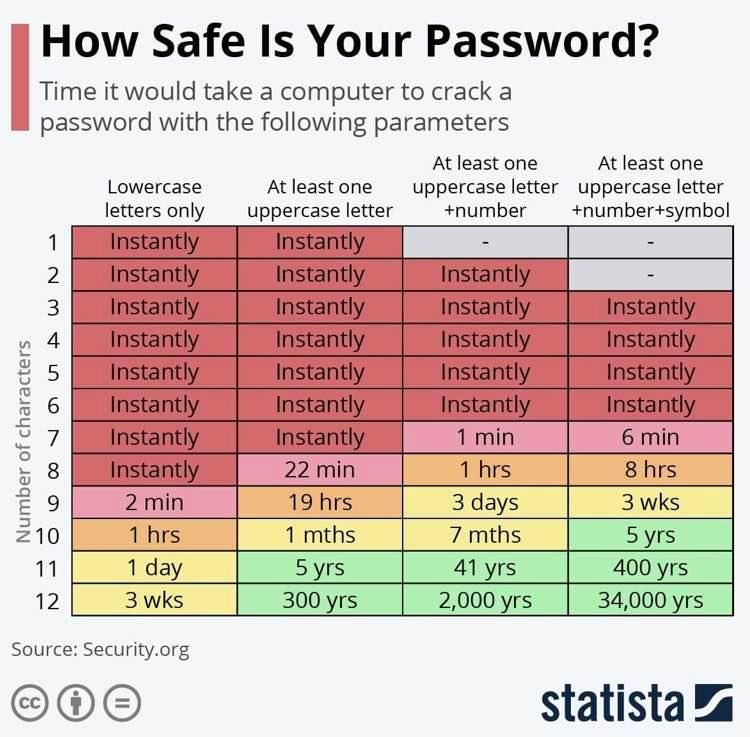La sicurezza cominciate ad ottenerla con una password di 10 caratteri alfanumerici con una maiuscola e un simbolo (ci vorranno solo 5 anni), mentre darete una gran bel filo da torcere con 11 caratteri di cui uno maiuscolo e un solo numero al suo interno (41 anni per tracciarla). Se poi riuscite a crearne una di 12 caratteri con una sola maiuscola, un numero e un simbolo, e ve la ricorderete, siete tranquilli per 34.000 anni!